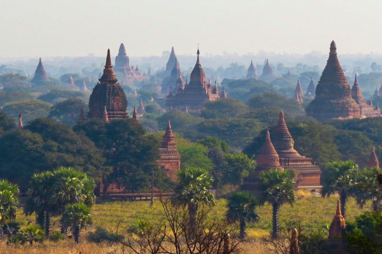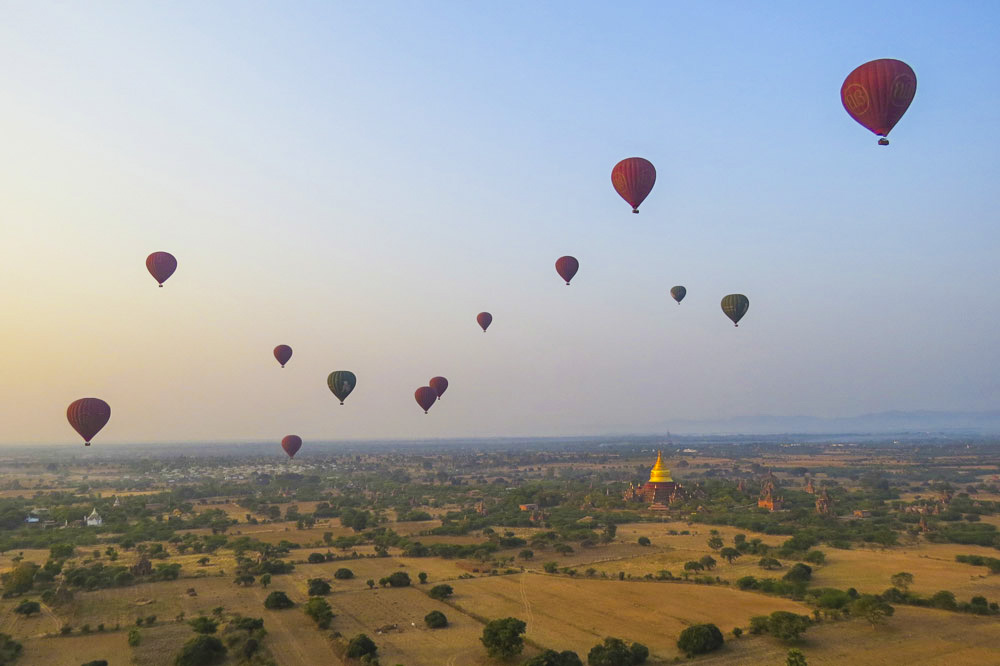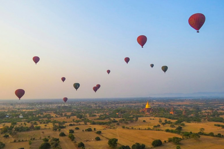 Balloons float over Bagan because the solar rises and divulges golden temples