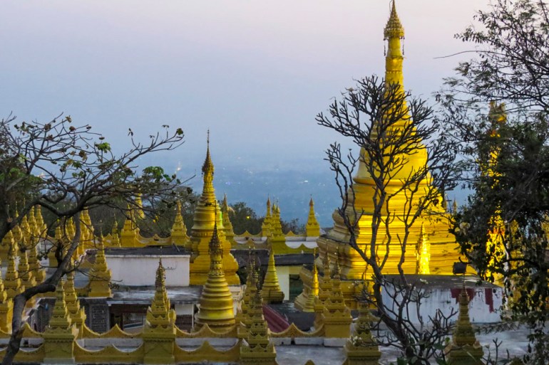 Atop Mandalay Hill, wanting down at a gilded shrine within the final mild of day