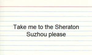 When I was in Suzhou for nine weeks I sometimes found myself either alone or in a small group of non-Chinese-speaking colleagues. The inhabitants of Suzhou at the time did not speak much English outside of hotels so to get to certain places and back and forth to the hotel we had notecards written out saying what we wanted or where we wanted to go. I had them all together in a little travel photo album and it worked brilliantly!