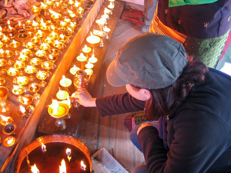 Shannon lighting candles at Namo Buddha Monastery in Kathmandu Valley