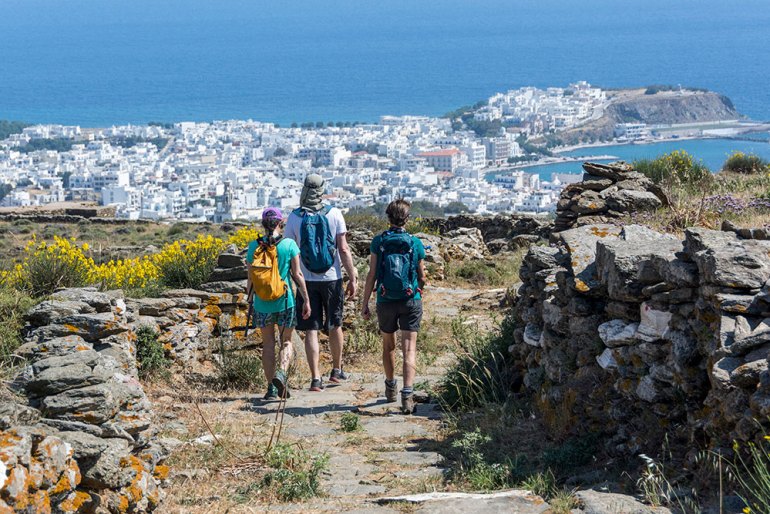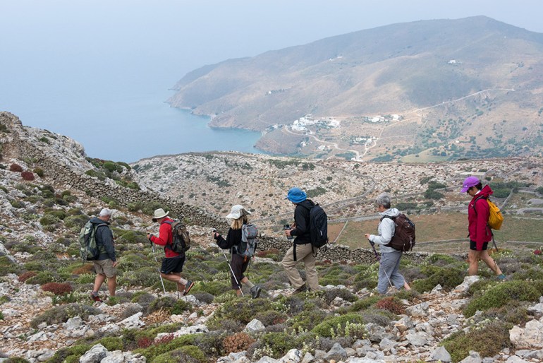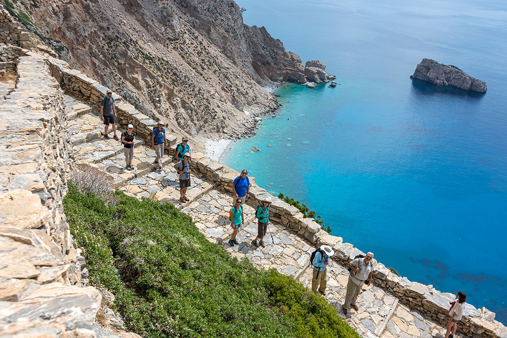 Kostas leading the group down a stone path on Amorgos with the beautiful Aegean in the background.