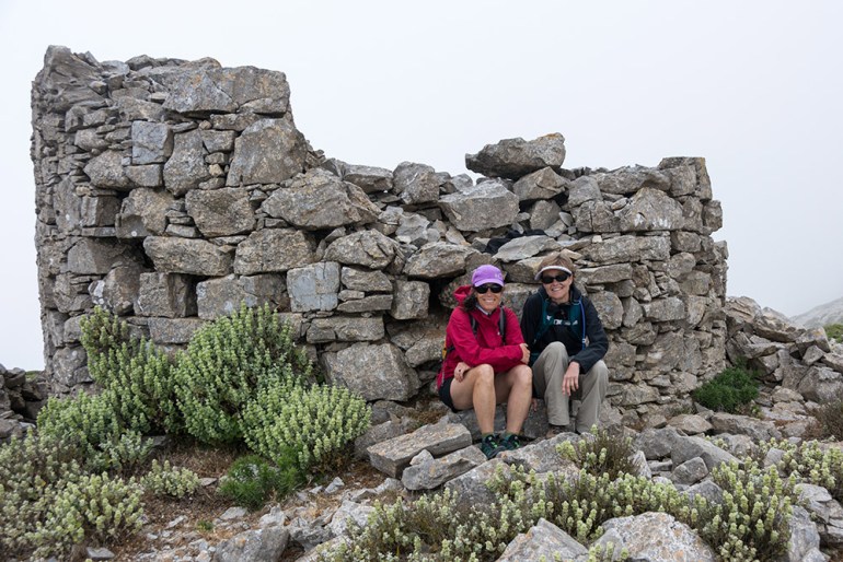 Resting at the one of the ancient windmills at the top of Mt. Krikelos (2,200′) on Amorgos.