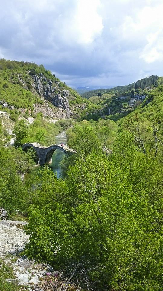 Hiking the ancient paths of Zagoria. The bridge of Plakida with Kipoi village in the background.