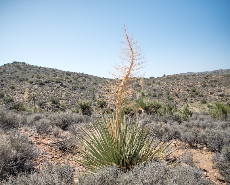 From here, we hike the California Riding & Hiking Trail for a few minutes to get to the 2.2-mile Big Trees Trail — a flat trail full of otherworldly-looking Joshua Trees twisting and intertwining that connects to Lost Horse Mine Trail.