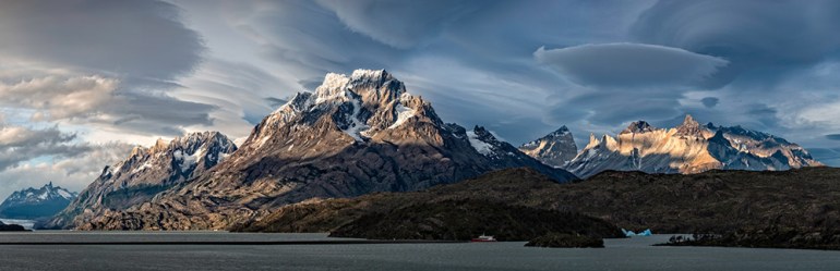 Late afternoon over the Torres del Paine massif with lenticular clouds